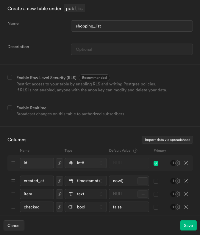 shopping_list, and the table has anitemcolumn withtextcontent and acheckedcolumn withboolcontent. Thecheckedcolumn also has a default value offalse. This is in addition to the default columns,idandcreated_at.You should now be on the page for the table, and can input new rows of data using the + Insert row button.